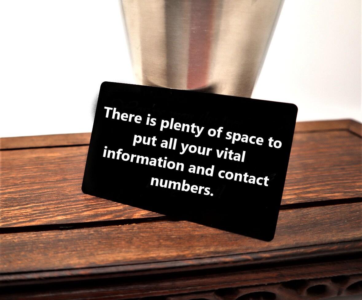 ℹ️ Stay safe and stylish with our Personalized Laser Engraved Medical Alert Card! This sleek and durable card is designed to keep you prepared for any medical emergency while adding a touch of personal flair to your everyday carry.