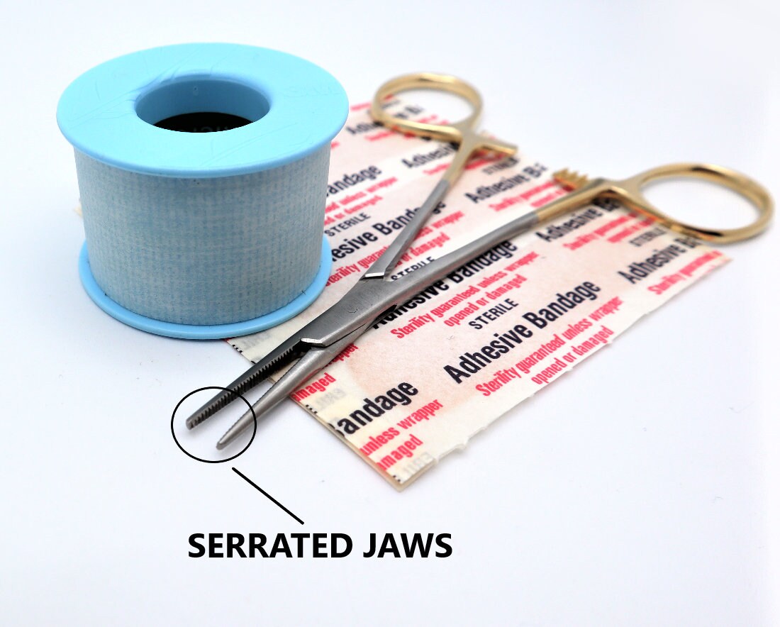 Fully serrated forceps is a pliers-like tool with three position locking ratchet providing adjustable tension and firm grip.