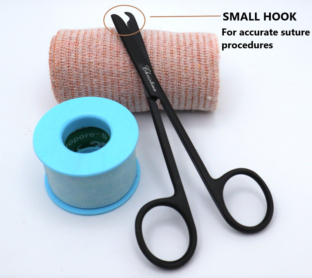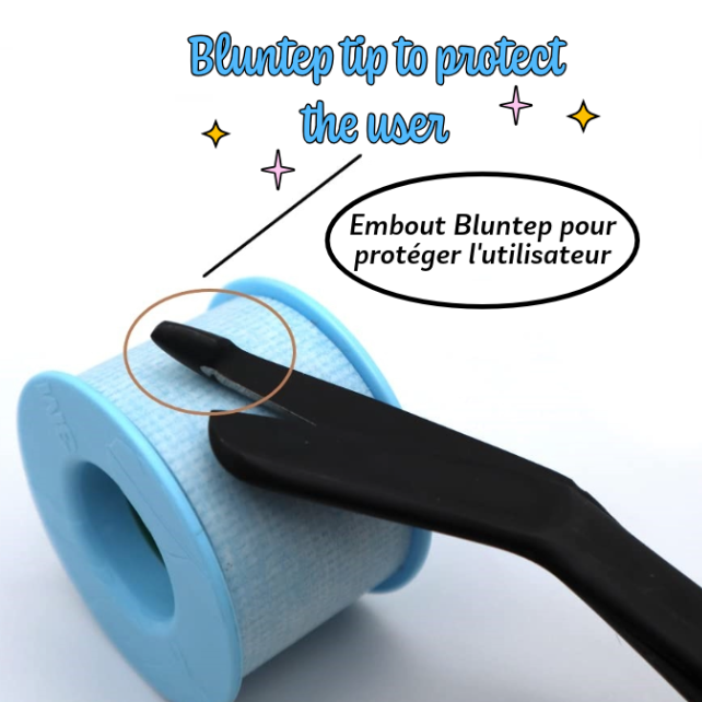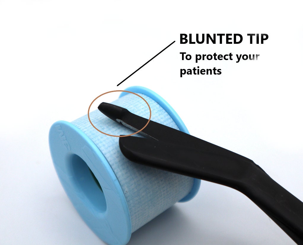 Blunt-end safety tip and a sharp blades for a smooth procedure. Flat tipped, angled bottom blade slides easily under all types of clothing, dressing, bandage tapes, and gauzes.