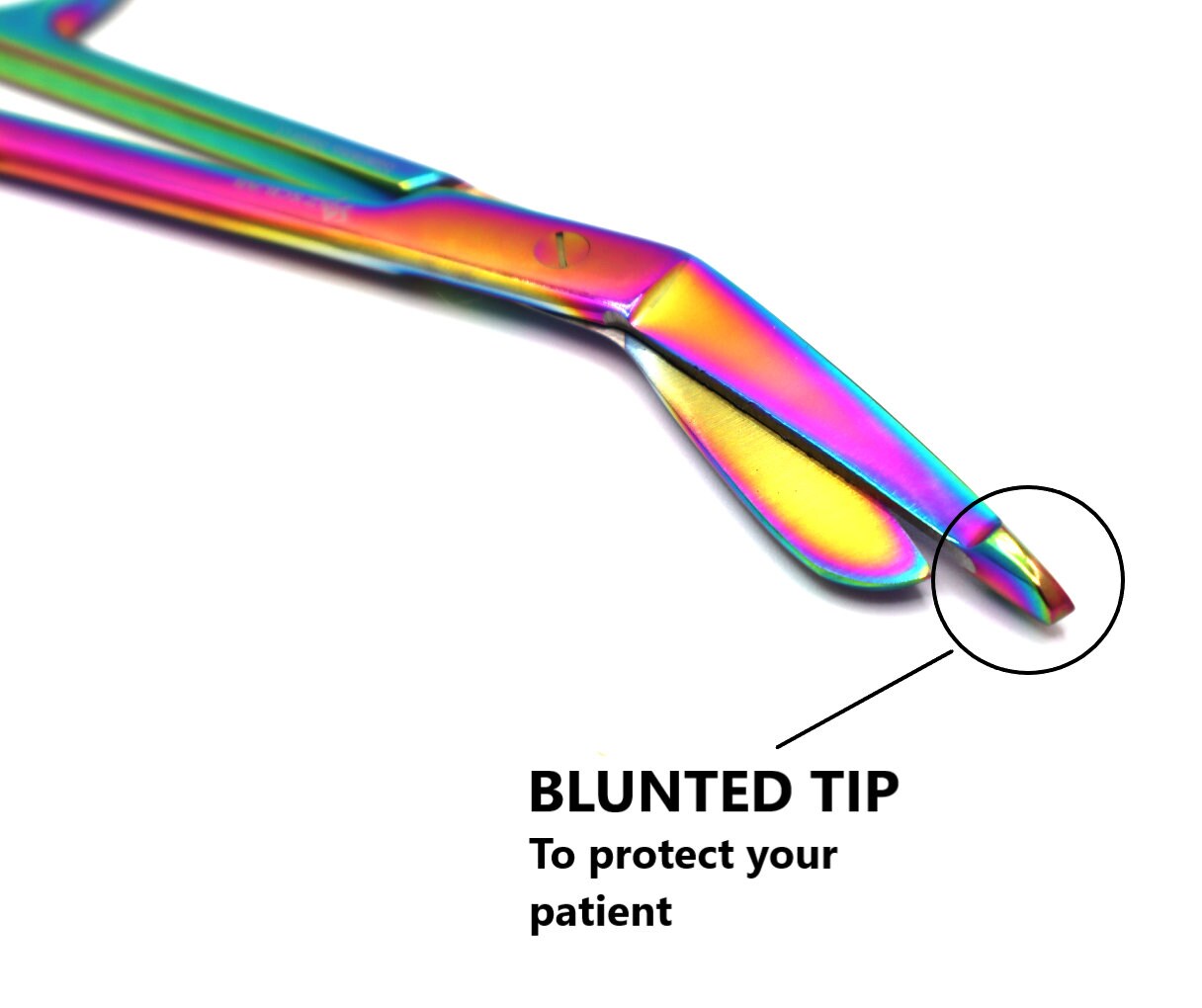 Flat tipped, angled bottom blade slides easily under all types of bandages, dressing, tape, gauze, and clothing.