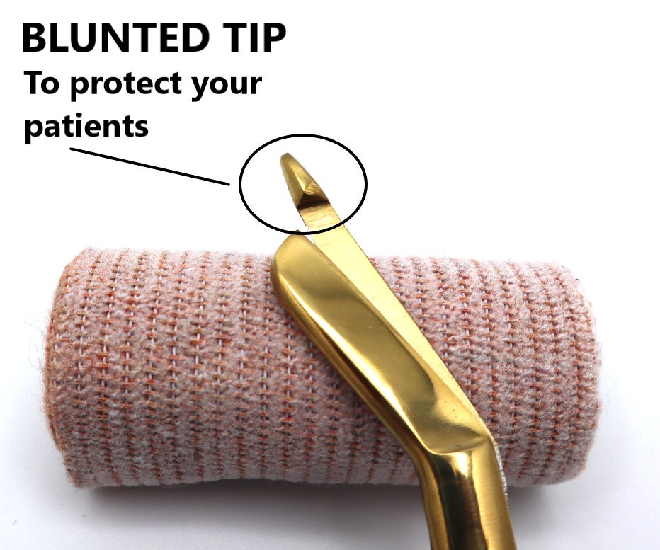 Flat tipped, angled bottom blade slides easily under all types of clothing, dressing, bandage tapes, and gauzes.
